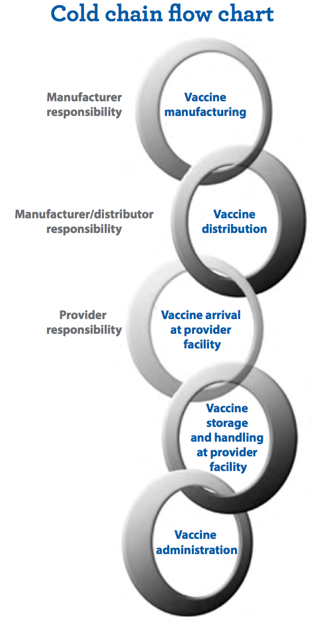 For other less fragile vaccines, the CDC recommends a series of guidelines for referigeration or freezing. Importantly, they have come up with a "Toolkit" as a means of outlining how health care organizations should distribute and maintain vaccines. The general outline is called a "Cold chain flow chart." This chart as shown below highlights each stage of vaccine production from manufacturing to administration.