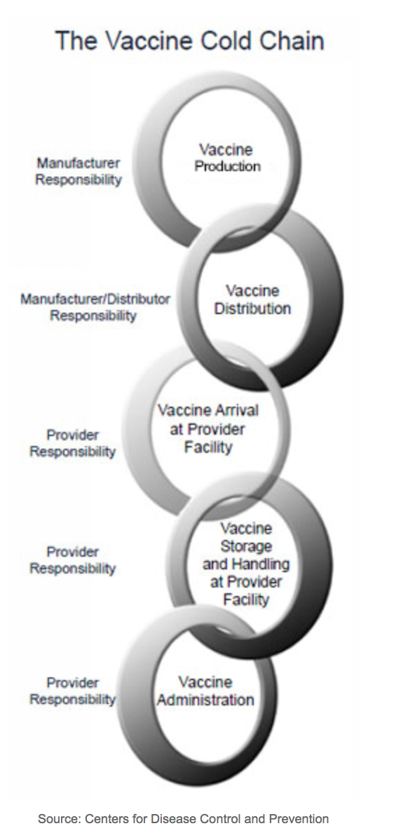 Vaccine storage and handling is critical because it can reduce vaccine potency leading to poor protection against disease. Improper storage and handling of vaccines can also have a financial impact. Vaccine storage and handling errors can occur at various intervals ranging from the time the vaccine is manufactured to the time it is administered. The major component of handling and storage of a vaccine is temperature. Excessive heat, cold, or light can exposure can reduce the potency of vaccines. The temperature-controlled environment used to maintain and distribute vaccines in optimal condition is called the vaccine cold chain (Image below).