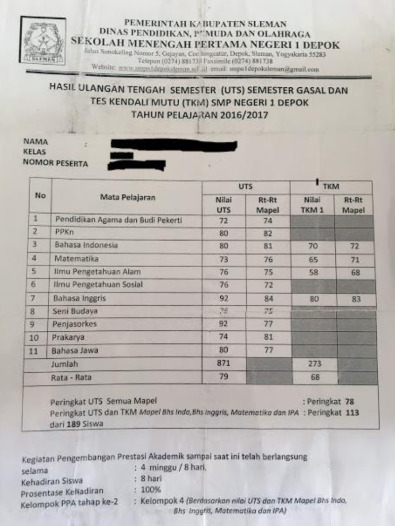 This photo shows one page of a student’s report card. The first class listed is "Pendidikan Agama dan Budi Pekerti," which translates to a course about all religions, cultures, morals, and how to be a good person/citizen.