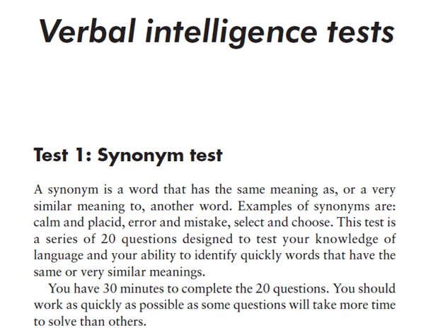 In this update, I will be looking at IQ tests primarily aimed at self-assessment as a means of entertainment albeit restricting myself to the book IQ and Psychometric Tests: Assess your personality, aptitude and intelligence (2nd Edition, 2007 [2004]) by Philip Carter that proclaims its main purpose to be “identify your strengths and weaknesses”. I will look at some Verbal Intelligence Test questions and analyzing it uses and limits as well as the extent to which it serves its purpose. The section begins as follows: