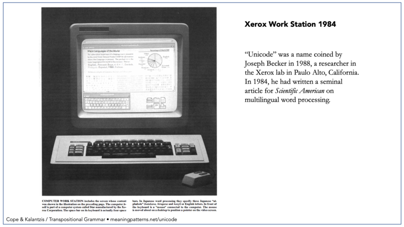 Unicode was a name coined by Joseph Becker in 1988, a researcher in the Xerox lab in Palo Alto, California.32 In 1984, he had written a seminal article for Scientific American on multilingual word processing,33 and in 1987–88 was working with a colleague at Xerox, Lee Collins, and Mark Davis at Apple. A Unicode Working Group formed in 1989, Microsoft, Sun, IBM, and other companies soon joining, creating today’s Unicode Consortium in 1991. At its first release in October 1991, Unicode consisted of 7,161 characters. The June 2017 release added 8,518 new characters, bringing the total to 136,755.34