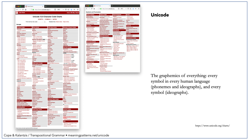 Most Unicode characters are ideographs; just a few are phonemes, even if the relatively few phonemes in the character set still get a lot of use. By the time we reach dentistry symbols and emojis in Unicode, we encounter ways of meaning that are getting close to image. There has been a tendency in the digital age to move our character set towards ideographs – not only numbers, but symbols and emojis of internationalization in our contemporary multilingual spaces, the navigational icons in user interfaces, and visual design that marks the larger textual architectures of the page and the screen. “We are all becoming Chinese,”36 says Jack Goody,§AS1.4.7a anthropologist of writing, flowers, and love, if only half in jest.