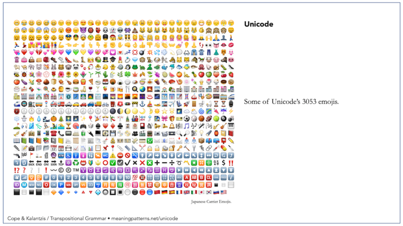 In a manner that has become typical of the global governance of digital meanings, companies have eschewed competition to form non-profits that they control so singular and universal agreement can be reached about the means of production, distribution, and exchange of meanings. Representatives from Facebook, Google, Amazon, and Adobe are now on the Unicode Consortium’s board of directors.35