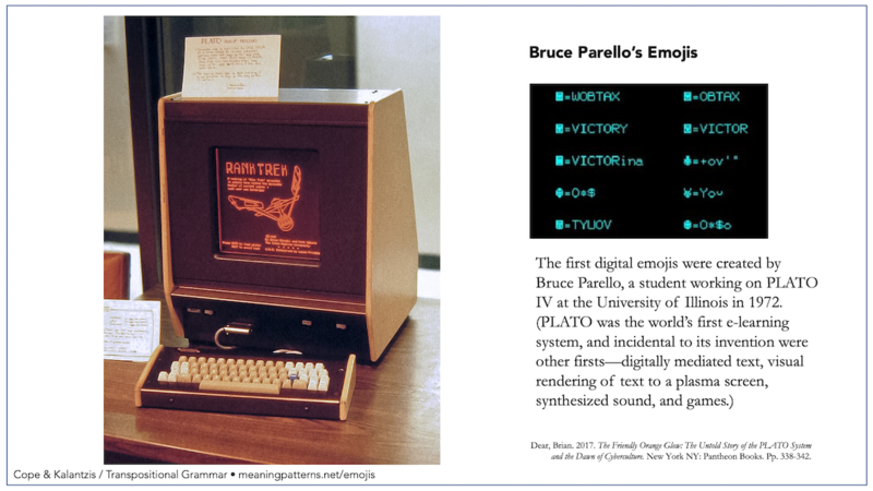 The first digital emojis were created by Bruce Parello, a student working on PLATO IV at the University of Illinois in 1972.38 (PLATO was the world’s first e-learning system, and incidental to its invention were other firsts – digitally mediated text, visual rendering of text to a plasma screen, synthesized sound, and games.39)
