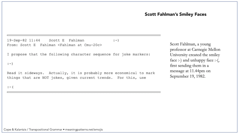 Scott Fahlman, a young professor at Carnegie Mellon University created the smiley face :-) and unhappy face :-(, first sending them in a message at 11.44pm on September 19, 1982.40