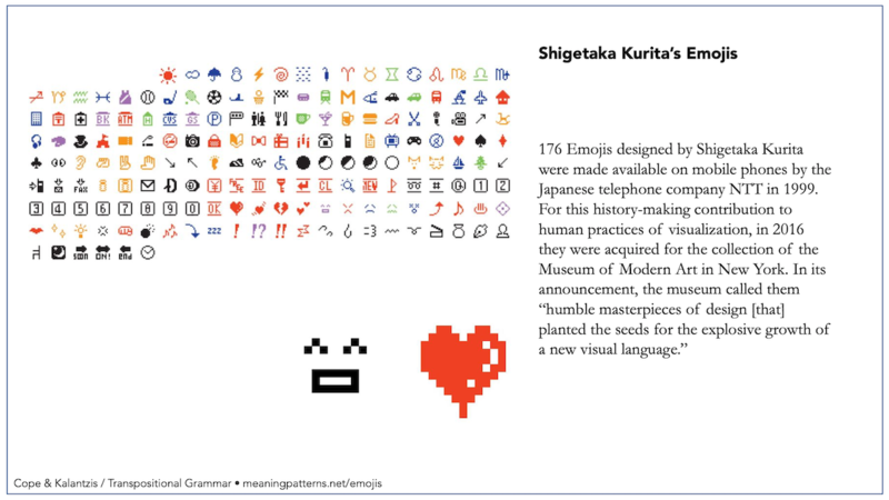 Moving beyond the constraints of abstract and arbitrary phonemes and graphemes, in the era of total globalization, emojis of likeness have burgeoned to become a universal, translingual semantics. Here is another place where text is diverging still further from speech, using more likenesses and fewer abstractions. Though of course, even if more universal for their divergence from speech, they are not without cross-cultural weirdnesses45 and divergent interpretations.46