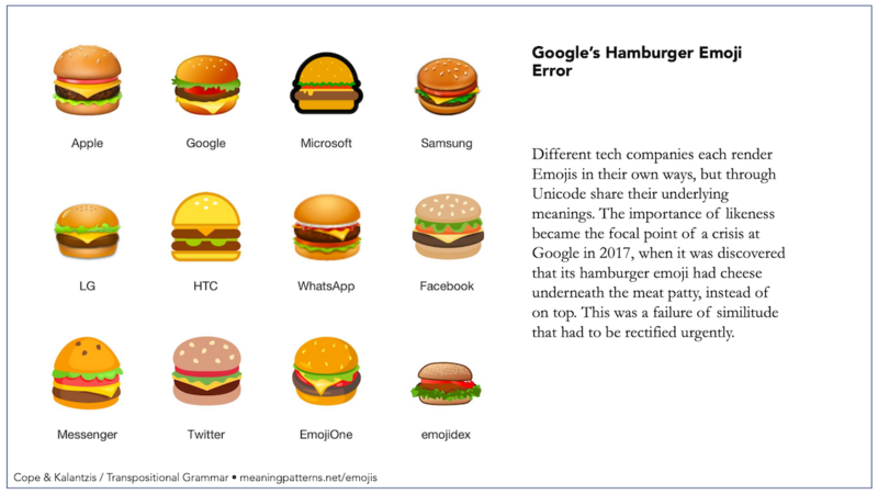 Different tech companies each render emojis in their own ways, but through Unicode share their underlying meanings. The importance of likeness in so many emojis became the focal point of a crisis at Google in 2017, when it was discovered that its hamburger emoji had cheese underneath the meat patty, instead of on top. This was a failure of similitude that had to be rectified urgently.44