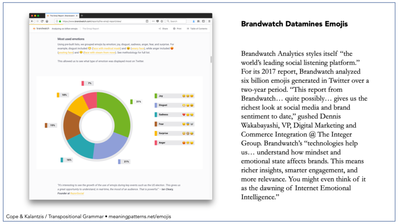 Brandwatch Analytics styles itself “the world’s leading social listening platform.” For its 2017 report, Brandwatch analyzed six billion emojis generated in Twitter over a two-year period. “This report from Brandwatch … quite possibly … gives us the richest look at social media and brand sentiment to date,” gushed Dennis Wakabayashi, VP, Digital Marketing and Commerce Integration @The Integer Group. Brandwatch’s “technologies help us … understand how mindset and emotional state affects brands. This means richer insights, smarter engagement, and more relevance. You might even think of it as the dawning of Internet Emotional Intelligence.”47