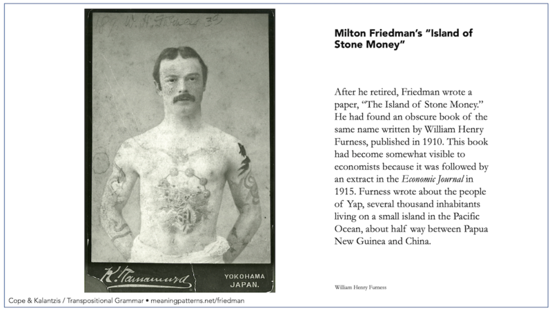 Having told his version of the Yap story, Friedman asks, “how many of us have literal personal direct assurance of the existence of most of the items we regard as constituting our wealth? Entries in a bank account, property certified by pieces of paper called shares of stocks, and so on and on, illustrate how important ‘myth,’ unquestioned belief, is in monetary matters.”276