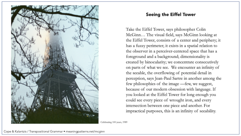 There are profound differences between perceiving and envisioning. In the form of image, this is the difference between encountering material structures of meaning, and figuring ideal structures. The visual field, says McGinn looking at the Eiffel Tower, consists of a center and periphery; it has a fuzzy perimeter; it exists in a spatial relation to the observer in a perceiver-centered space that has a foreground and a background; dimensionality is created by binocularity; we concentrate consecutively on parts of what we see.75 We encounter an infinity of the seeable, the overflowing of potential detail in perception, says Jean-Paul Sartre in another among the few philosophies of the image76 – few, we suggest, because of our modern obsession with language. If you looked at the Eiffel Tower for long enough you could see every piece of wrought iron, and every intersection between one piece and another. For impractical purposes, this is an infinity of seeability.