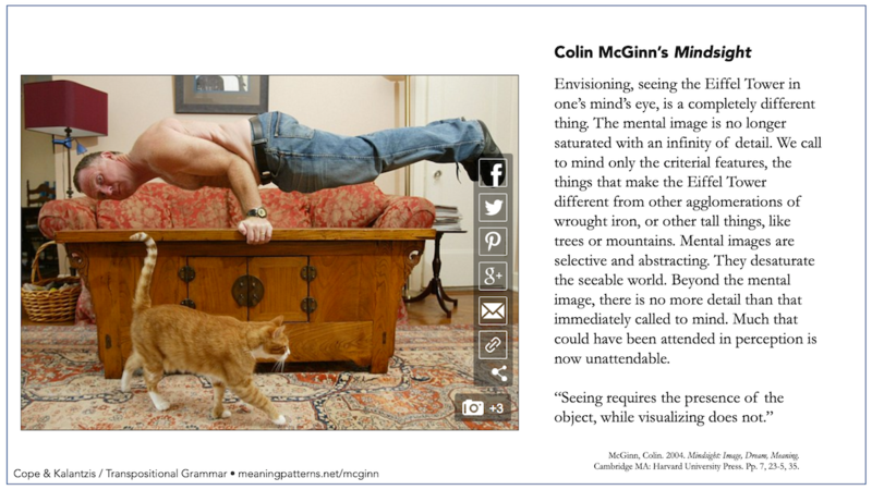 - Cope, Bill and Mary Kalantzis, 2020, Making Sense: Reference, Agency and Structure in a Grammar of Multimodal Meaning, Cambridge UK: Cambridge University Press, pp.283-85 [§ markers are cross-references to other sections in this book and the companion volume (AS); footnotes are in this book.]