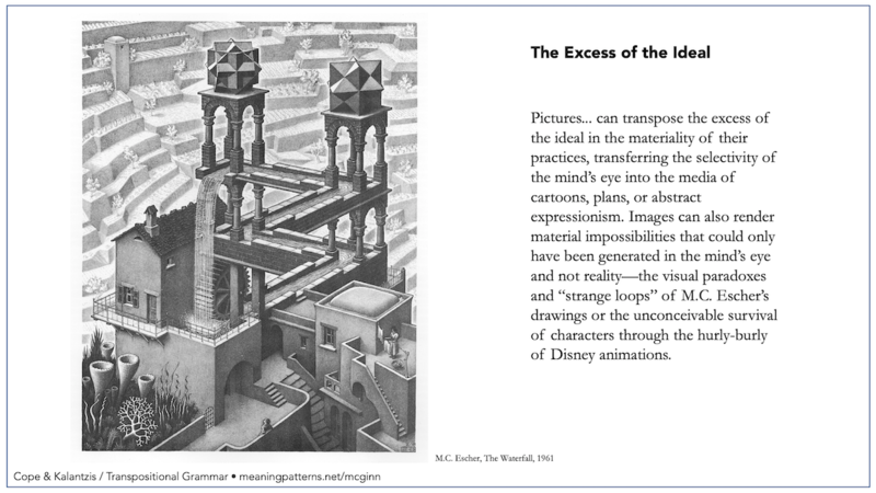 Pictures themselves can transpose the excess of the ideal in the materiality of their practices, transferring the selectivity of the mind’s eye into the media of cartoons, plans, or abstract expressionism. Images can also render material impossibilities that could only have been generated in the mind’s eye and not reality – the visual paradoxes and “strange loops”85 of M.C. Escher’s lithographs or the unconceivable survival of characters through the hurly-burly of Disney§AS2.5.1b animations.
