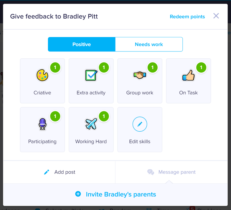 Besides that, students enjoy Class Dojo because I can assign them points for participation, creativity, effort, and a series of other behavioral/interactive skills. Also, I can remove these points, but this an action I only take after I have talked to the student and tried to solve it in a different way. Another option (which is very interesting) is that parents can also access Class Dojo, and I can send them a message if there is anything they need to know, while they can follow the progress of their children.