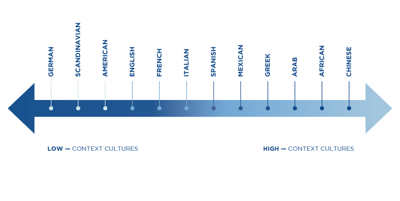 Ο Edward T. Hall (1977), Αμερικανός ανθρωπολόγος και ερευνητής της διαπολιτισμικότητας, διέκρινε πολιτισμούς υψηλού και χαμηλού πλαισίου. Η διάσταση αυτή αναφέρεται στον βαθμό στον οποίο συγκεντρώνουμε πληροφορίες από το φυσικό, κοινωνικό και ψυχολογικό πλαίσιο μιας αλληλεπίδρασης (υψηλό πλαίσιο) ή από τον σαφή κώδικα (χαμηλό πλαίσιο). Αναλυτικότερα, οι όροι υψηλού και χαμηλού πλαισίου αναφέρονται στο γεγονός ότι, όταν οι άνθρωποι επικοινωνούν, θεωρούν δεδομένο τον όγκο των όσων γνωρίζει ο ακροατής για το υπό συζήτηση αντικείμενο. Στην επικοινωνία χαμηλού πλαισίου, ο ακροατής γνωρίζει πολύ λίγα και ο ομιλητής πρέπει να του εξηγήσει στην ουσία τα πάντα. Στην επικοινωνία υψηλού πλαισίου, ο ακροατής είναι ήδη «ενταγμένος στο πλαίσιο» και επομένως δεν χρειάζεται πολλές συνοδευτικές πληροφορίες.