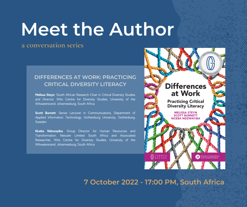Meet the Author: A Conversation Series - Melissa Steyn, Scott Burnett and Nceba Ndzwayiba, the authors of "Differences at Work: Practicing Critical Diversity Literacy" on Friday, 7 October 2022 (17:00 PM, South Africa).