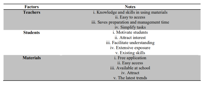 While many studies have shown that new technology is beneficial for students in the classroom, there are some factors that limit the use of said technology. According to the journal article, Turkish Journal of Physiotherapy and Rehabilitation, Factors Affecting the Use of Technology in Special Education Classrooms, factors exist in the use of technology for three different groups: teachers, students and materials. Figure 4 below shows the factors for each group.