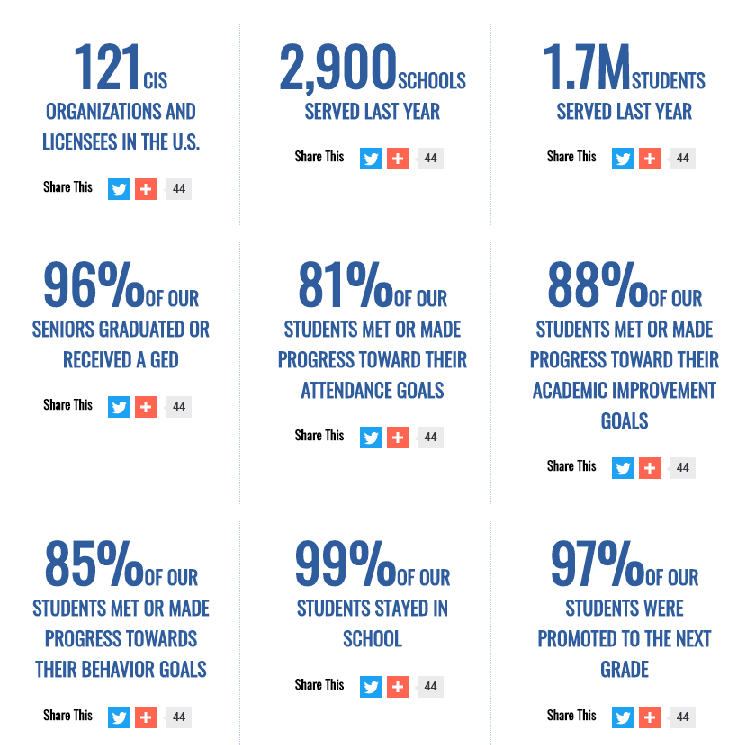 “We measure our success by the results we are able to achieve for the young people we serve. We carefully evaluate all aspects of our programs, and use that information to constantly improve. Explore our national end of year results and data collected from our approved sources” (Communities in Schools).