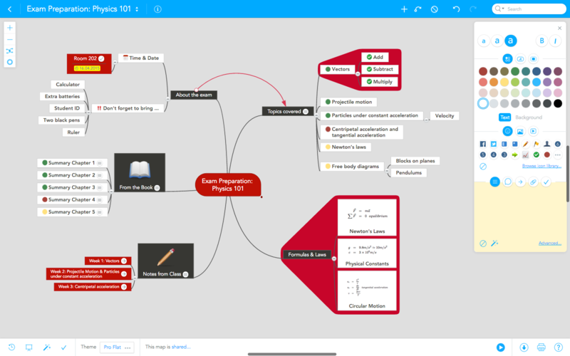 - The sidebar: this ois where you can change font size, background colors, add icons, and much more. You can add pictures or videos directly from the web, fully customize the backgrounds and borders of your ideas and branches, or even add custom visuals!