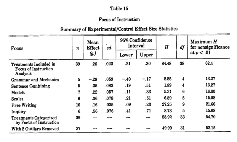 Graham and Perin affirmed, as Hillocks did, that certain pedagogical moves had a demonstrably stronger effect on student writing growth than others. Their findings, echoing Hillocks', are summarized below:
