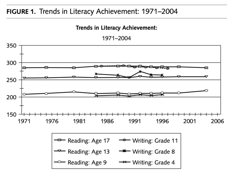 As the table below illustrates, Applebee and Langer found that student progress (or lack thereof) in reading and writing did not notably improve over a twenty-give year period, despite the fact that discoveries, such as Hillocks, had been widely disseminated by 2004 (the last year of data available to Applebee's & Langer's work).