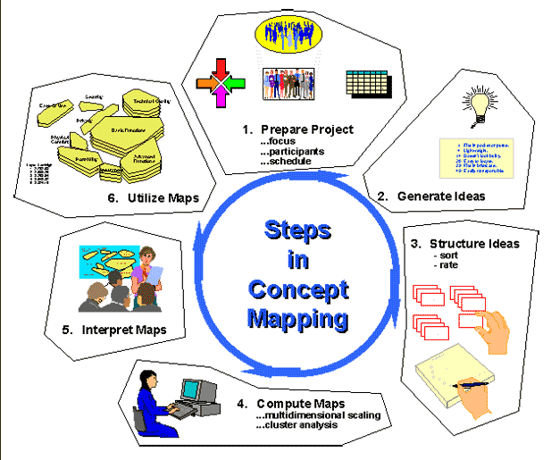 Trochim describes six differents steps in the concept mapping process. Depending on how many people are participating, a facilitator is necessary to organize the process at the start. In step 2 everyone is able to generate ideas, concerning the focus of this particular projects. When all the ideas are collected, everyone can structure the ideas. First to see what ideas are more or less the same, second to rate the ideas (how important, how innovative etc on a scale.). This process make it possible to choose an idea by the whole group. This kind of concept mapping is very useful during a research with a lot of stakeholders.