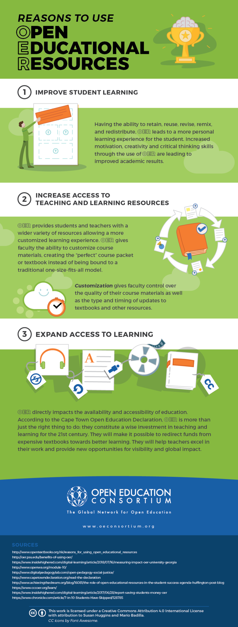Open education is a philosophy about the way people should produce, share, and build on knowledge.OERs are learning materials that can be modified and enhanced because their creators have given others permission to do so. The individuals or organizations that create OERs—which can include materials like presentation slides, podcasts, syllabi, images, lesson plans, lecture videos, maps, worksheets, and even entire textbooks—waive some (if not all) of the copyright associated with their works, typically via legal tools like Creative Commons licenses, so others can freely access, reuse, translate, and modify them.