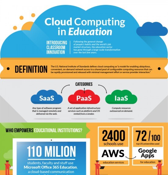 The benefit of cloud based computing for education is ubiquitous learning. Students can use whatever type computing device they have available as long as they can connect to the internet. They can collaborate, write, create, watch tutorials, and receive feedback. Another benefit is schools districts which lack substantial budgets for technology can utilized this low cost alternative. Many cloud based services are free or at competitive prices. Many of the largest companies such as Micorsoft and Google have cloud based computing for education on the internet. Schools no longer need to have private servers, storage capacity, purchase software, or a team of IT staff.