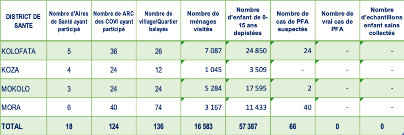 Aucun vrai cas de PFA n’a été détecté pendant les 03 de balayage. Cependant avec 16 583 ménages visités et 66 cas présumés de PFA rapportés, on peut conclure que le balayage a été suffisamment rigoureux pour être certain de l’absence des cas de PFA manqués. La poursuite de l’activité en routine par l’ensemble des comités de vigilances constitue le résultat à long terme de l’activité. Pour renforcer ce système de surveillance, il est souhaitable de former des membres supplémentaire et l’étendre au District de Goulfey, Makary, Kousseri et Mada.
