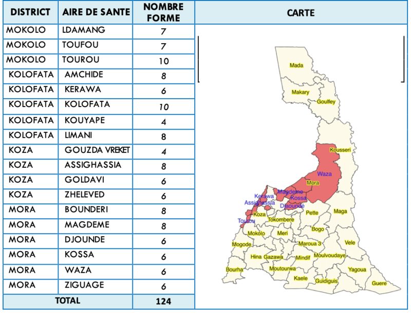 La détection de 04 de Polio Virus Sauvage (PVS) de type 1 et 02 cas de virus dérivés des vaccins (cVDPV2) dans l’État de BORNO au Nigeria au courant de l’année 2016 place la Région de l’Extrême Nord à risque élevée d’importation du PVS ou de sa circulation a bas bruit compte tenu des faiblesses observées dans la surveillance de PFA au cours des deux évaluations de la réponse à l’épidémie (OBRA) conduites en avril et en novembre 2017. Par ailleurs, la présence d’une part des populations mobiles à l’instar des nomades, des réfugiés et des déplacés internes et d’autres part, des localités difficiles d’accès du fait de l’insécurité ou de situation insulaire dans le lac Tchad constituent des facteurs de risque principaux pour cette importation ou circulation du virus. Les faiblesses relevées par les évaluations OBRA étaient notamment la non-atteinte des localités d’accès difficiles par les activités de surveillance et la faible implication de acteurs communautaires. Il a été alors recommandé de densifier le réseau de surveillance communautaire en impliquant les Agents de Santé Communautaire, les tradipraticiens, les leaders traditionnels, les organisations à base communautaire, les ONG locales et internationales, les Forces de Maintien de l’Ordre et les Comité de vigilance. La mise en place du système de notification par téléphone AVADAR dans 06 Districts a contribué à augmenter la notification des cas par les membres de la communauté. Cependant, dans les Districts de Santé de Kolofata, Mora, Koza et Mokolo, près d’une centaine de localités frontalières avec le Nigeria sont classées comme à sécurité compromise rendant ainsi toute activité de recherche active des cas très difficile voire impossible. Afin de détecter à temps toute forme de circulation de Polio Virus Sauvage, il est essentiel de rechercher activement et notifier à temps les cas de PFA dans tous les villages quel que soit le niveau d’accessibilité. C’est dans ce but que le MINSANTE avec l’appui de l’OMS a organisé dans le cadre des activités de la phase 3 du plan d’urgence pour le bassin du lac Tchad, un balayage des tous les villages frontaliers à sécurité compromise dans les Districts de Kolofata, Mora, Koza et Mokolo par les membres des comités de vigilance formés à cet effet.