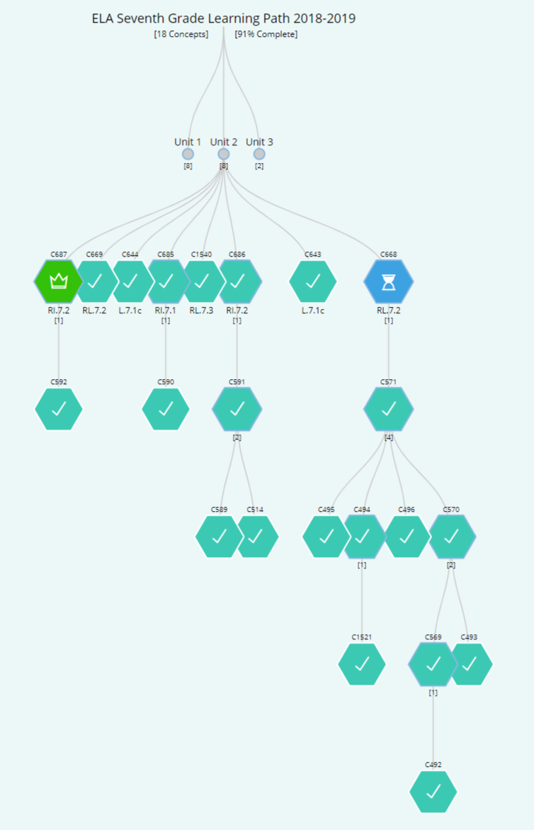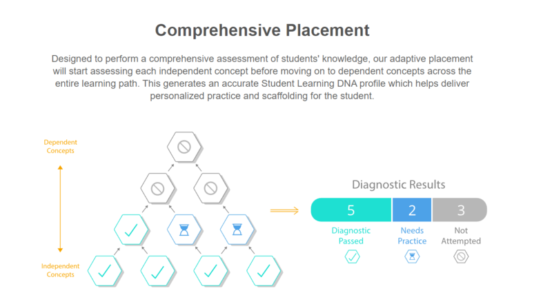 Each student starts by performing an adaptive placement assessment to determine how well they know the concepts that they must learn. This determines which concepts the student needs most help with and determines the approach taken to ensure that the student will be able to become proficient in them.