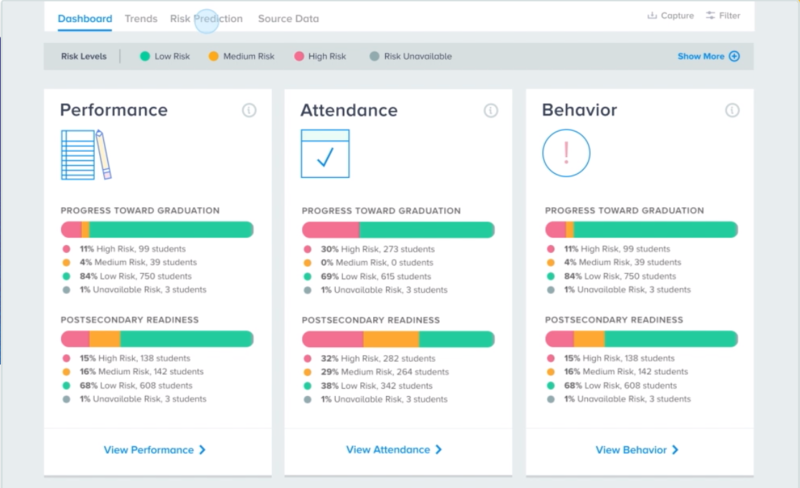 This tool is already being adapted and used in many schools in the US. The tool is mainly used by educators in order to transform data such as marks, assesments, attandance and behavior into intelligent data that the educator will than use in order to improve the class's overall performance. This can be briefly seen on the tool's dashboard, in the screenshot below.