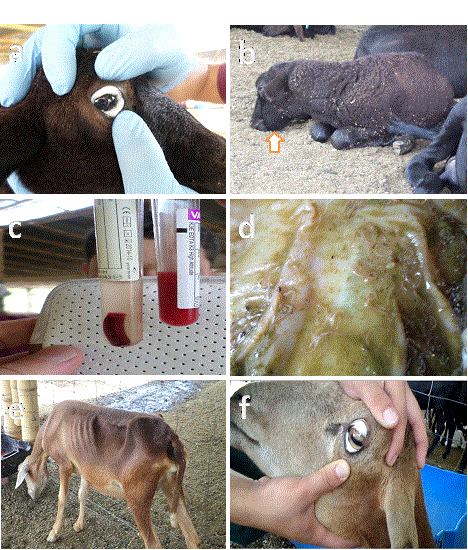 Four month old lamb (photos a-d): Famacha score of 5 (a), bottle jaw (b), blood taken from lamb two hours prior to death was watery and produced a very small clot (c) with a PVC = 4.5% and total plasma protein = 2.5 g/dL. On necropsy, thousands of thread-like white worms (identified as Haemonchus contortus) were retrieved from the abomasal fluid (d). Fecal pellets were well formed in the distal rectum and had a FEC of 45,000 epg. Apart from severe paleness of muscles and internal organs, no other gross abnormalities were observed. Postpartum ewe with a body condition score of 1 (e), Famacha score of 5 (f), PCV =8%, TP = 4 g/dL, and a fecal egg count of 13,050 epg. Fecal larval cultures confirmed Haemonchus to account for 97% of the total egg count. The animal had received fenbendazol and levamisol 2 weeks earlier and was found dead the day after the examination.